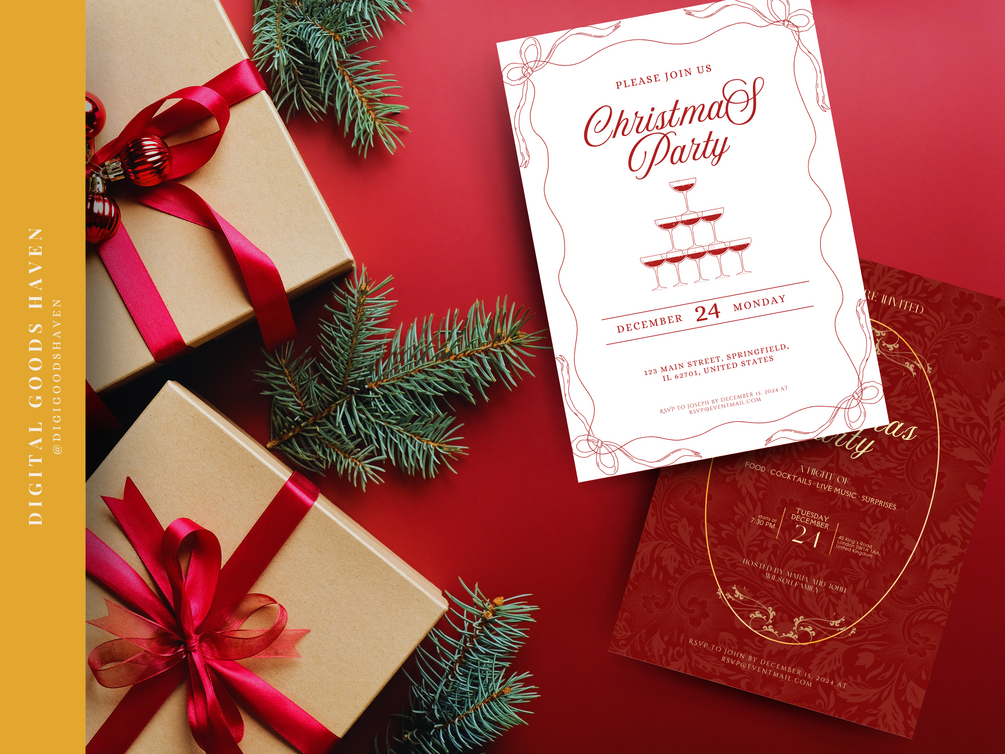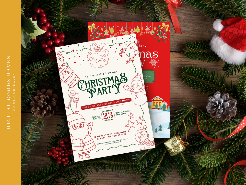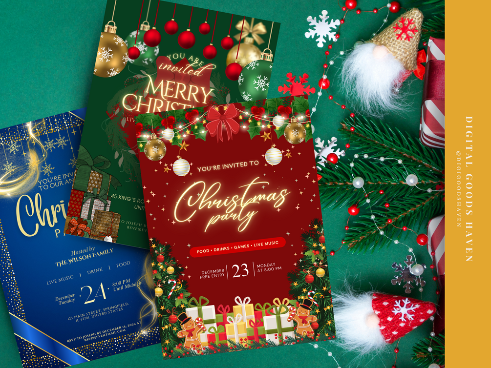 Bring the holiday spirit to life with this best Christmas Event Invitation Template Package! Featuring a variety of designs, from playful and casual to formal and luxurious, this bundle has everything you need to set the tone for any celebration. Whether you're hosting an intimate family dinner, a grand workplace party, or a community gathering, these templates cater to every occasion.
