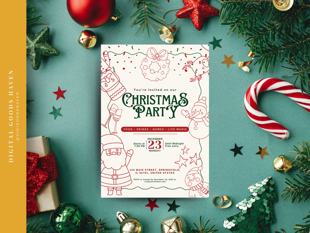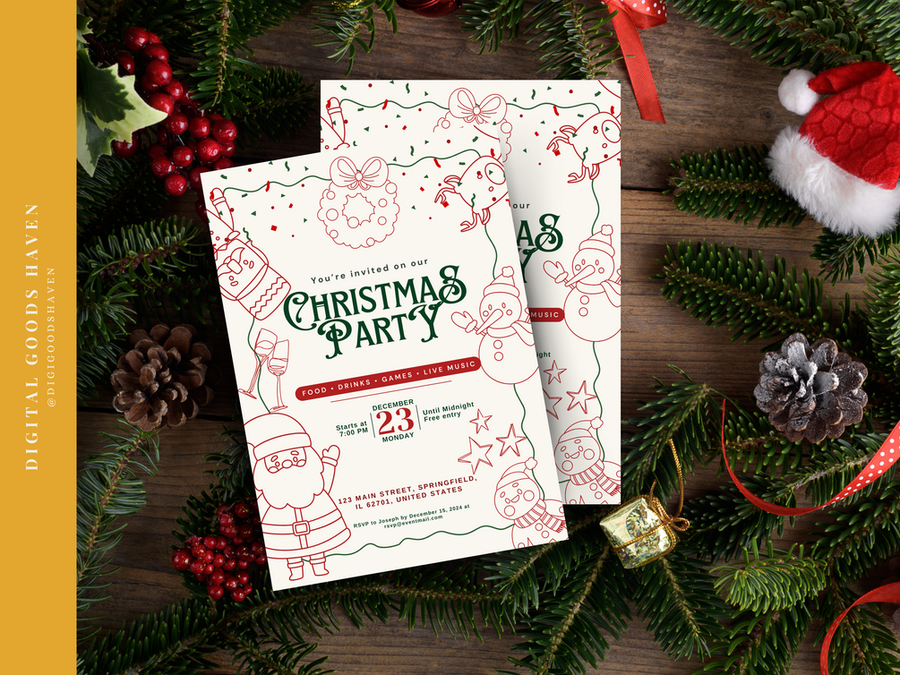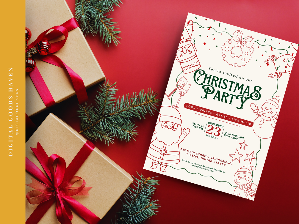 Brighten up your holiday celebrations with this playful yet polished invitation template! This template is perfect for inviting close friends, family, and even professional acquaintances to your Christmas gathering. Its whimsical touches add a sense of fun that’s sure to charm everyone, from kids to adults. Whether your event is casual or includes distinguished guests, this template strikes the perfect balance between festive and sophisticated.