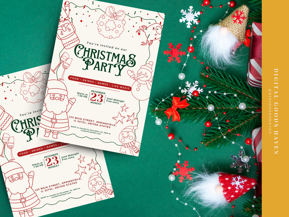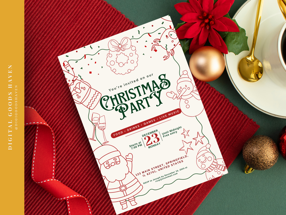 Brighten up your holiday celebrations with this playful yet polished invitation template! This template is perfect for inviting close friends, family, and even professional acquaintances to your Christmas gathering. Its whimsical touches add a sense of fun that’s sure to charm everyone, from kids to adults. Whether your event is casual or includes distinguished guests, this template strikes the perfect balance between festive and sophisticated.