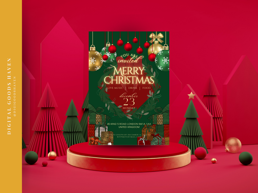 Throwing a big holiday bash? This template is your go-to choice for grand events like office parties, community celebrations, or large family reunions. The bold, festive layout instantly sets the tone for a lively and unforgettable party. Whether it’s a massive celebration in a grand hall or a bustling workplace event, this design ensures your invitation feels exciting, inclusive, and vibrant.