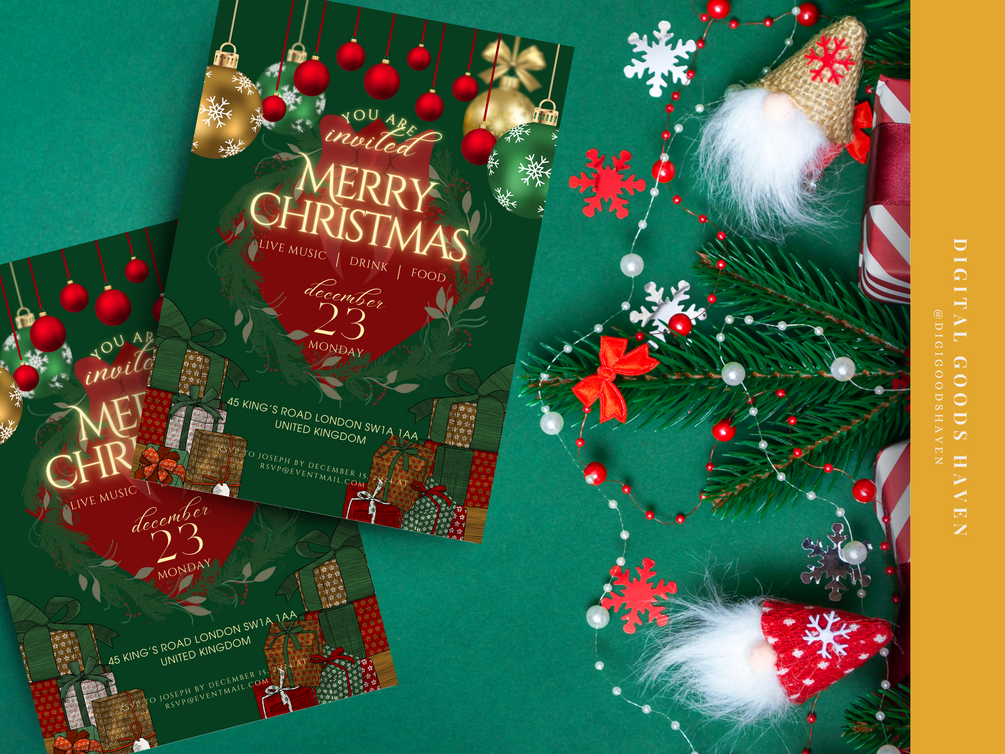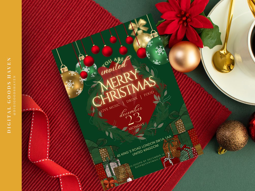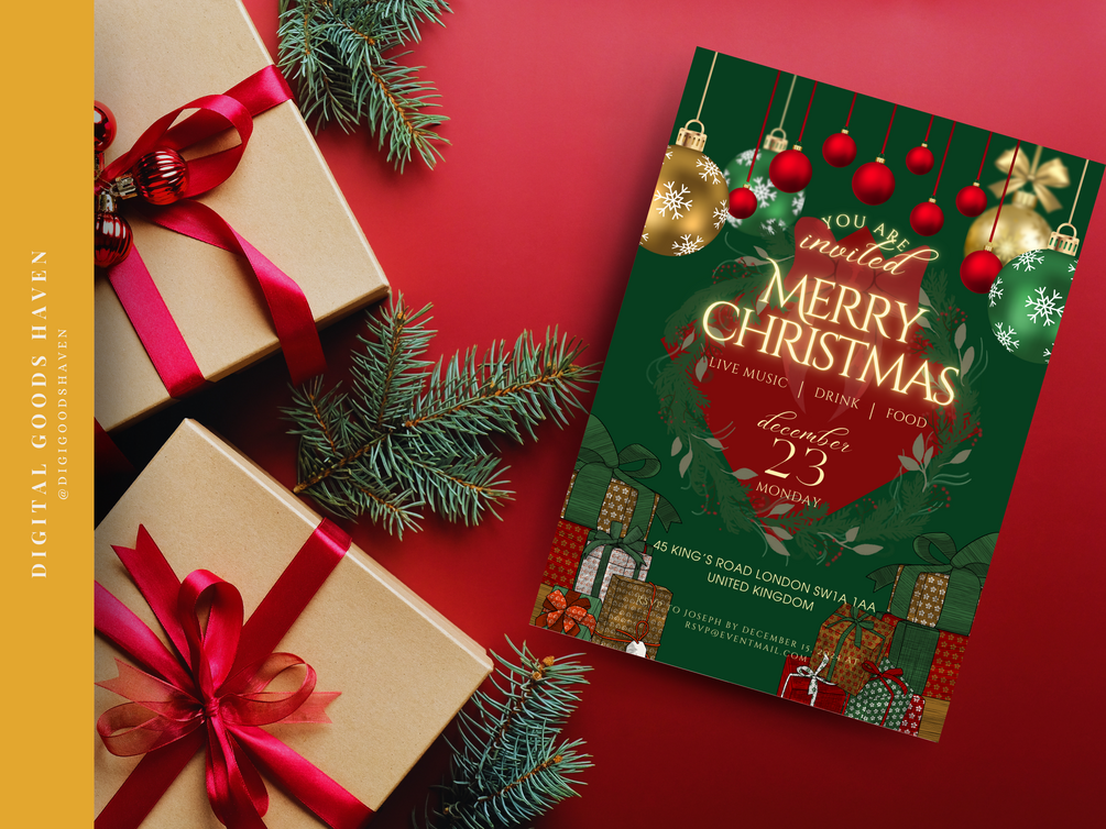 Throwing a big holiday bash? This template is your go-to choice for grand events like office parties, community celebrations, or large family reunions. The bold, festive layout instantly sets the tone for a lively and unforgettable party. Whether it’s a massive celebration in a grand hall or a bustling workplace event, this design ensures your invitation feels exciting, inclusive, and vibrant.