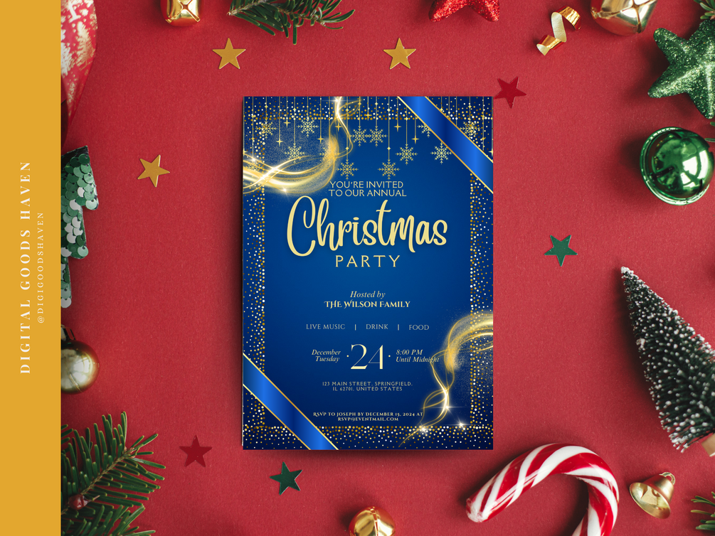 Add a touch of glamour to your holiday celebration with this striking blue and gold invitation template. Perfect for upscale events like gala dinners, music nights, or exclusive parties, this design exudes elegance and sophistication. The combination of rich colors and classy elements makes it ideal for creating an unforgettable first impression.