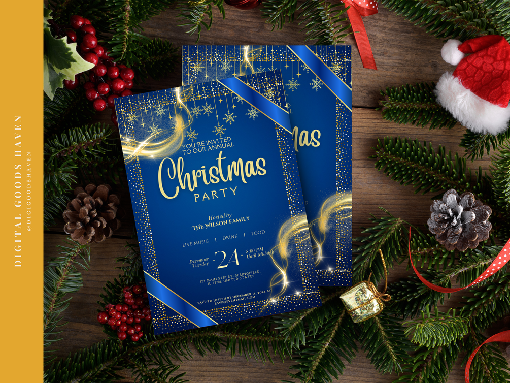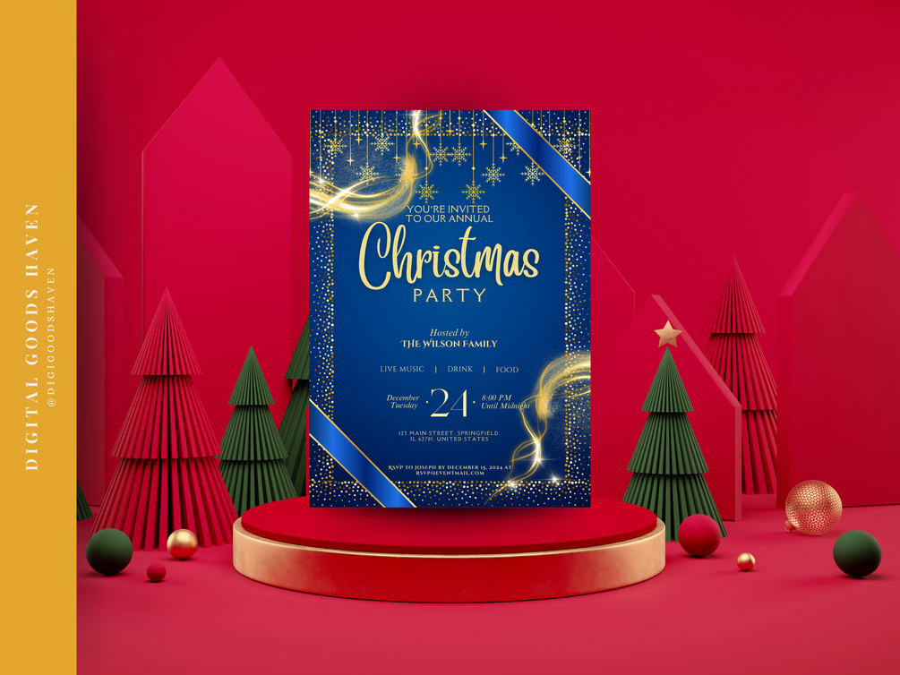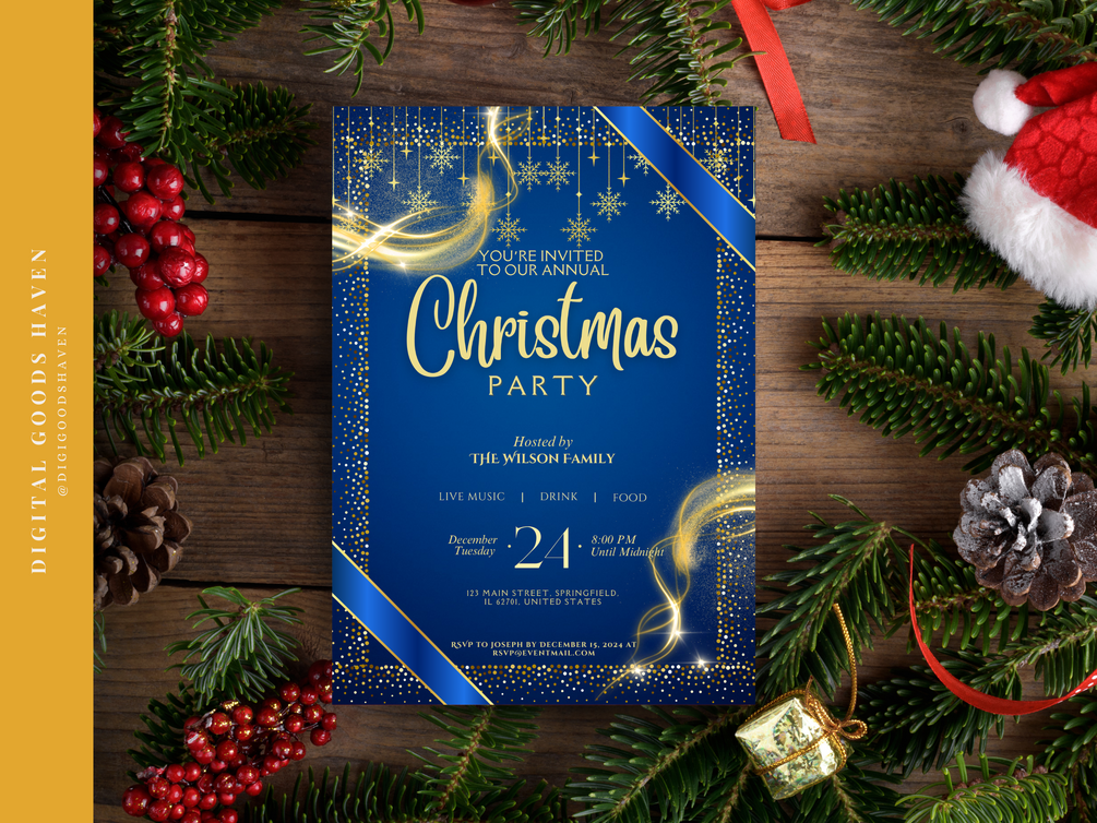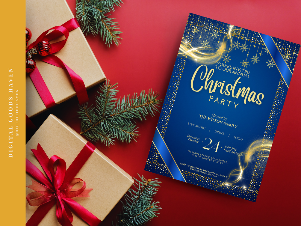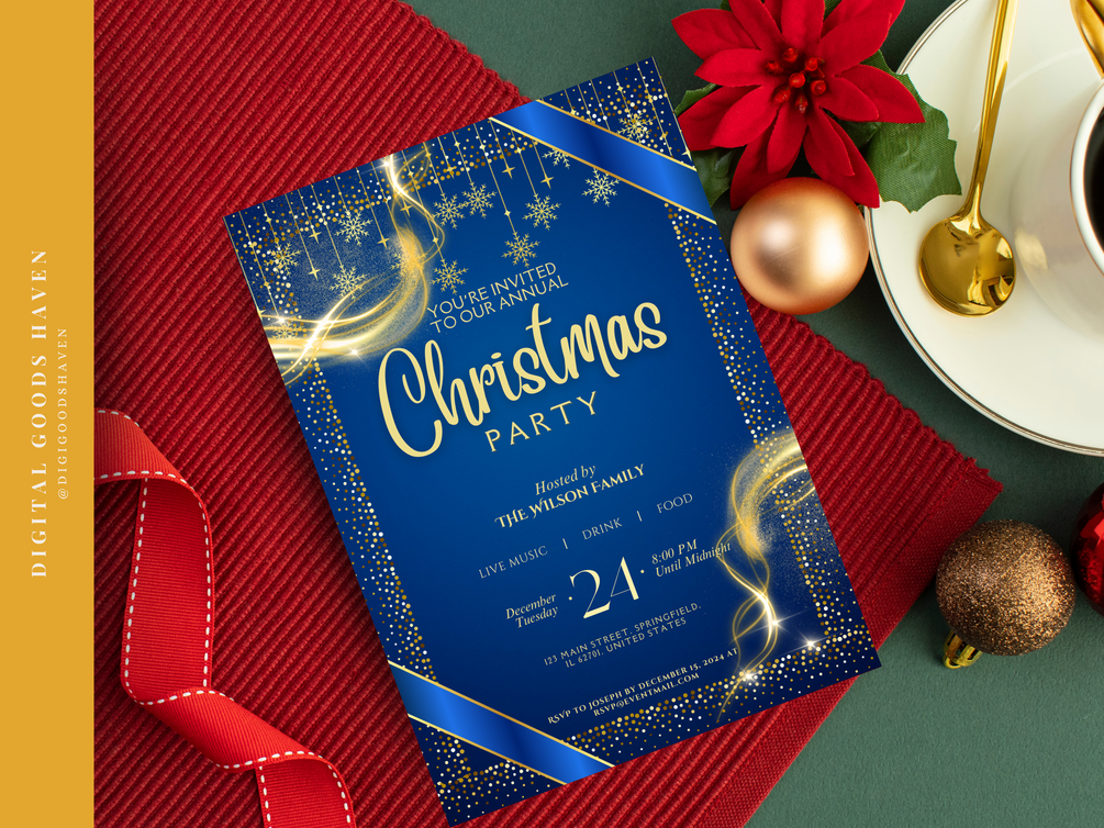 Add a touch of glamour to your holiday celebration with this striking blue and gold invitation template. Perfect for upscale events like gala dinners, music nights, or exclusive parties, this design exudes elegance and sophistication. The combination of rich colors and classy elements makes it ideal for creating an unforgettable first impression.