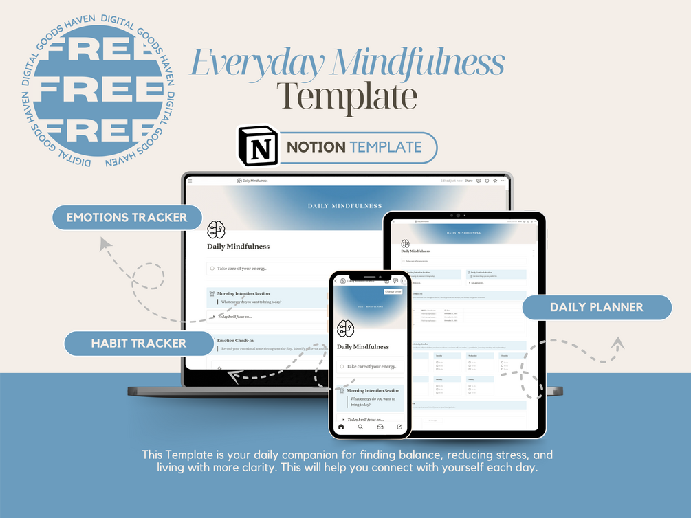 Daily Mindfulness Free Notion Template | Notion Second Brain ADHD Dashboard Productivity Self Care Planner Habit Tracker Life Planner Dark Mode Notion