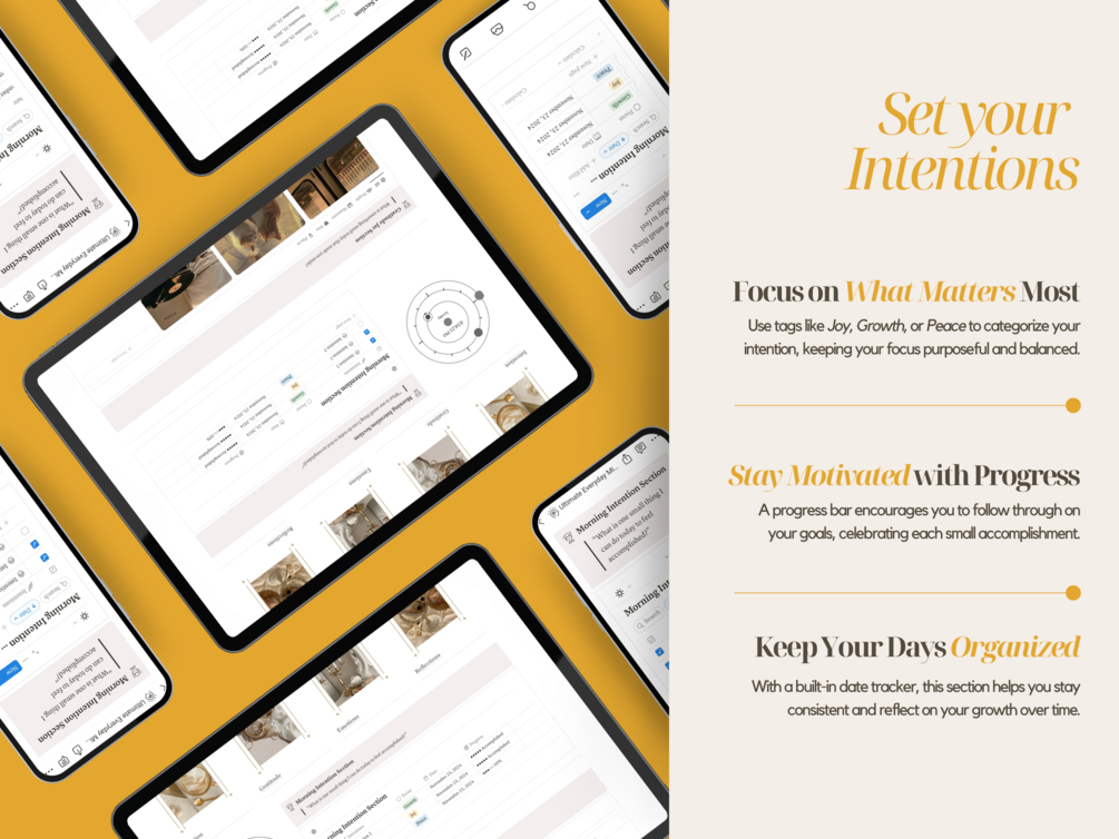 - Morning Intention Set the tone for your day with a clear focus. This section guides you to define your priorities and approach each day with intention.