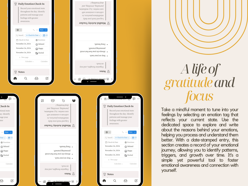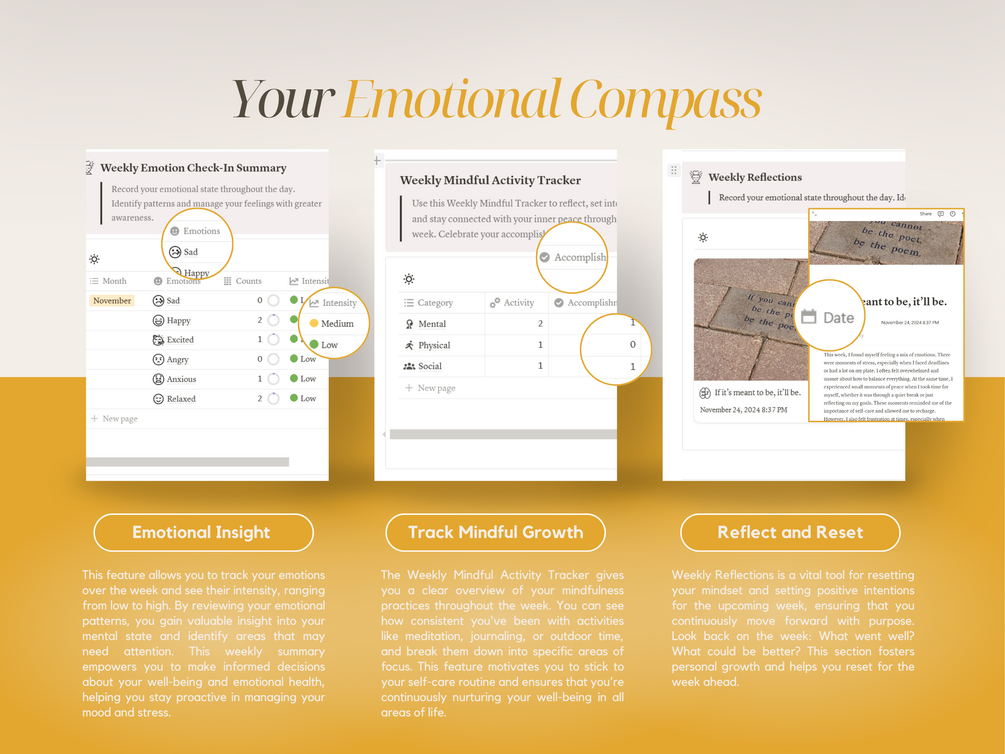 - Daily Emotion Check-In Pause and assess how you’re feeling emotionally and physically. This helps you identify patterns and take control of your mental state.